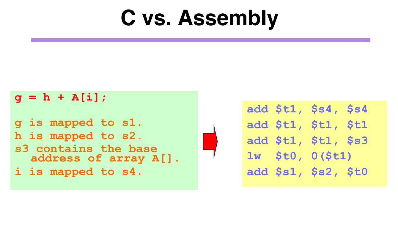- 컴파일러에 의해 고급 언어로 작성된 C코드가 MIPS의 어셈블리언어로 바뀐다.