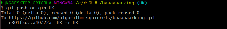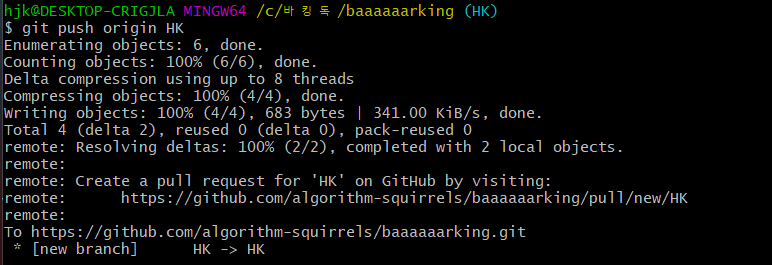 5. git push origin [브랜치명] 명령어를 사용해 Github에 코드를 push해준다.