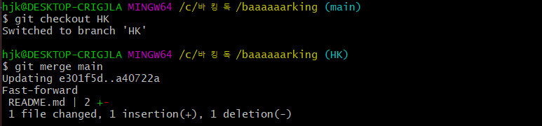 5. git checkout [개인 브랜치명] 을 통해 push하길 원하는 브랜치로 이동하고, 로컬의 main에 있는 내용을 해당 브랜치에 merge한다.
