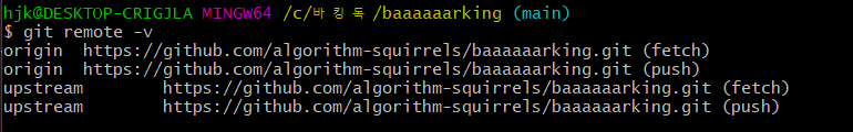 2. git remote -v를 사용해 확인해보면, 다음과 같이 원격 저장소를 나타내는 upstream 이 추가되었음을 알 수 있다.