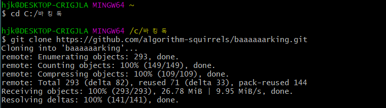 그리고 git clone [repo주소] 명령어를 사용해 클론받는다.