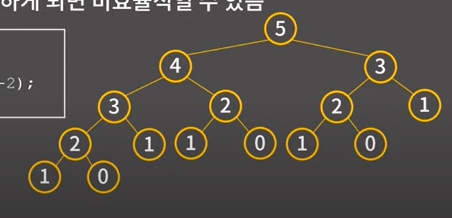 - 재귀함수가 자기 자신을 여러 번 호출하게 되면 예상과는 달리 굉장히 비효율적일 수 있다. 피보나치 수열을 재귀로 구현하는 상황이 이에 해당한다.