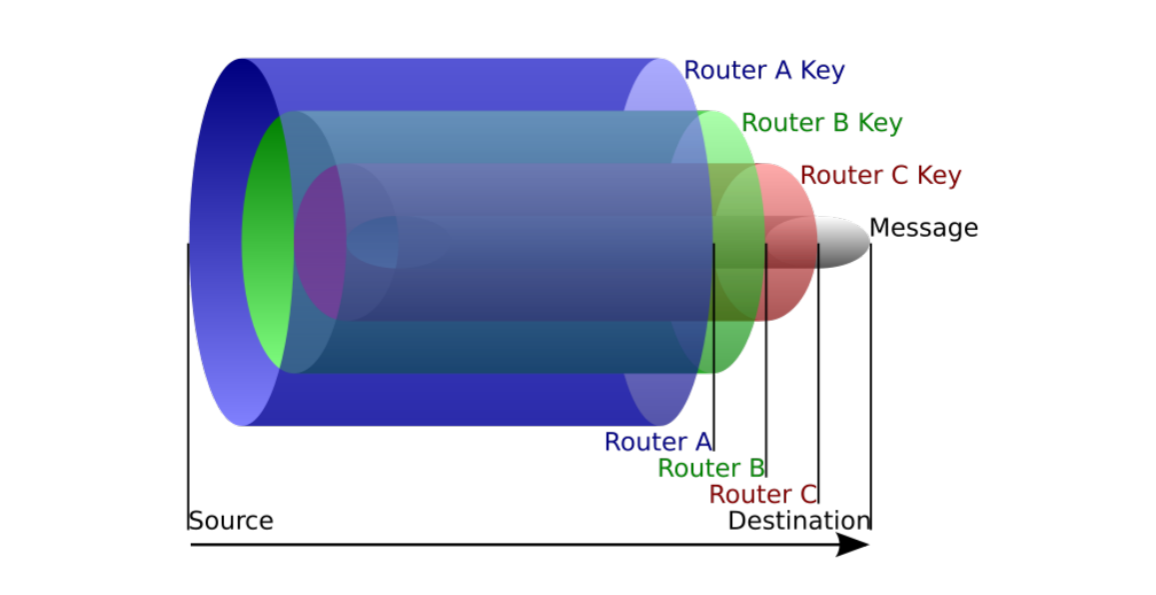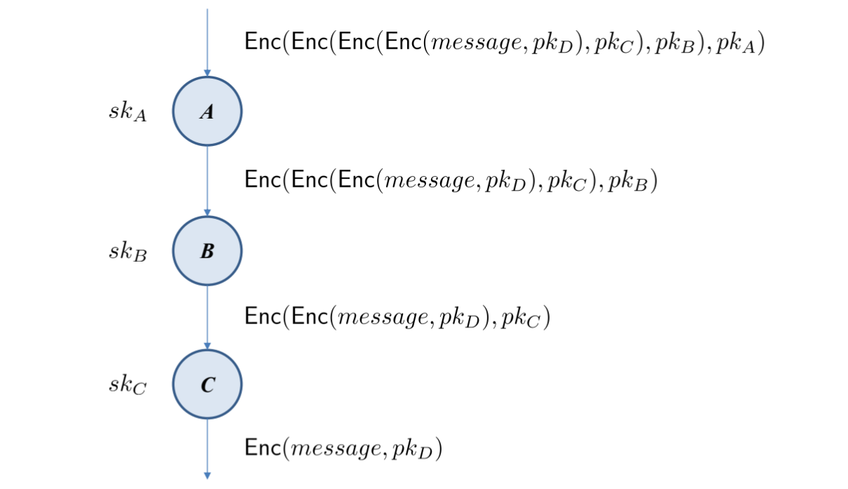 msg는 다음과 같이 선행되는 router에서 다음 router의 public key로 encrypt되어 전달되고, 다음 router가 받아서 자신의 secret key로 decrpyt하여 확인할 수 있게 된다.