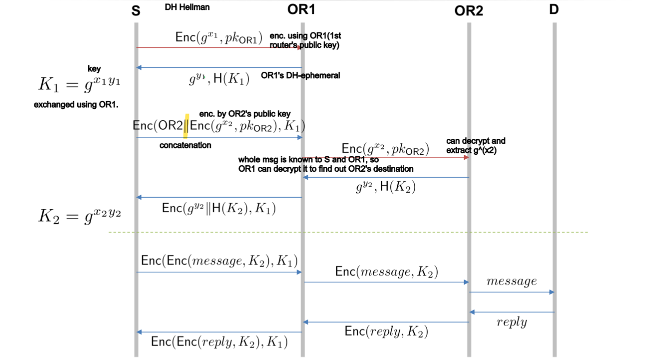 S에서 g^(x1)을 OR1의 public key로 encrypt하여 전송하면, OR1이 이를 받고 자신의 secret key를 g^(x2) 형태로 전송한다. 그럼 S와 OR1은 각자 g^(x1x2)를 계산하여, K1을 얻게 된다.
