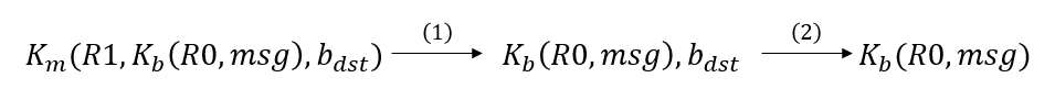 (2)에서 다음 mix가 데이터를 수신하면, 자신의 private key로 decryption을 진행하여 R1, Kb, bdst를 얻는다. 여기서 R1은 버리고 Kb를 b의 주소로 전송한다.