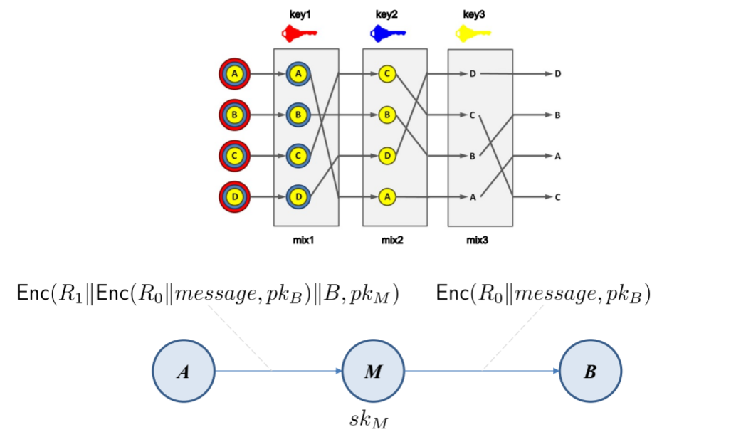 (1)에서 sender A가 random string R0와 msg를 concatenate하고 receiver B의 public key로 encrypt해 Kb를 얻는다. 그리고 다시 random string R1과 Kb, 그리고 B의 address를 다음 mix의 public key로 encrpyt한다.