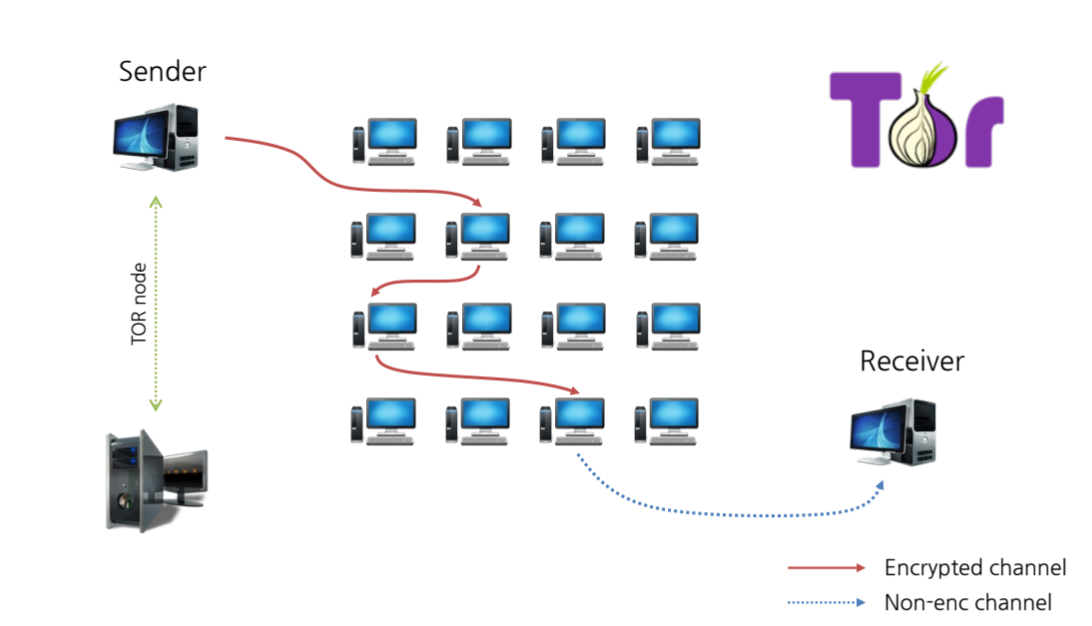 TOR 소프트웨어는 Onion Router들로 이루어진 네트워크를 사용한다. 자원하여 자신의 PC를 router로서 사용하기로 선택하면, encrypted된 정보들이 해당 PC를 거쳐 dst에 도달하게 된다. msg를 받는 사람 입장에서는 TOR의 종료 노드로부터 데이터가 오는 것처럼 보인다. TOR는 네트워크 경로를 파악하기 어렵기 때문에 DDos 공격 등에 악용되는 경우도 있다.