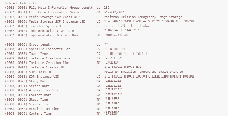여기서 확인되는 정보 중 어떤 것들은 task의 성능에 중대한 영향을 끼칠 수 있으므로 중요한 정보들은 데이터 수집 단계에서 정리해두는 것을 추천한다. 헤더 값은 pydicom 라이브러리를 사용하면 쉽게 읽을 수 있다. 기본적으로 dicom file마다 header값이 정의되어 있기 때문에, 아래 코드는 하나의 dicom file의 header를 읽는다.