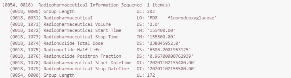 또 한 가지 알아두면 좋은 점은, 간혹 header 값이 nested 형태일 때가 있는데, 이 때는 상위 항목에 먼저 접근을 한 다음 원하는 것에 접근해야 한다. 예를 들어, 다음과 같이 생긴 header 정보 중 (0018,1075) Radionuclie Half Life의 값을 가져오고 싶다면, dcm.RadiopharmaceuticalInformationSequence[0].RadionuclideTotalDose로 접근할 수 있다.