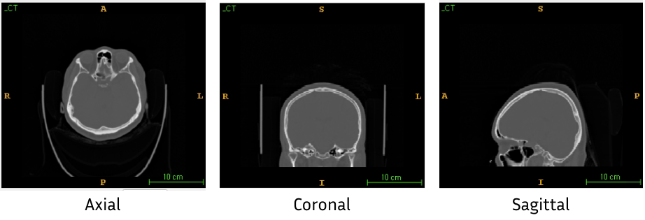 3D 영상의 수평면을 말한다. 즉, 우리가 흔히 생각하는 z축에 수직인 방향으로 영상을 잘랐을 때 보이는 면을 axial plane이라고 한다. Sagittal과 Coronal 방향도 존재하는데, 이들은 축에 비유하기 보다는 촬영한 환자 기준으로 이해하는 게 편하다. Brain을 촬영했다고 가정했을 때, 머리의 양옆을 지나는 면을 coronal , 앞뒤를 지나는 면을 sagittal이라고 부른다.